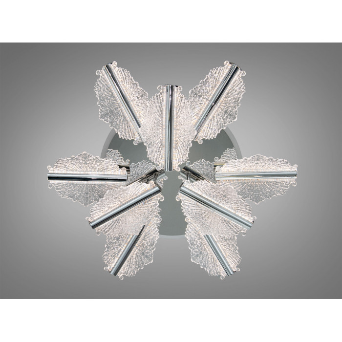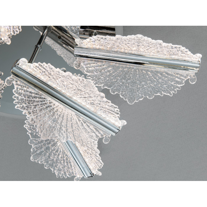 Жорсткий металевий каркас забезпечує надійність, а акриловий розсіювач рівномірно м’якше подає світло та має меншу вагу порівняно зі склом. Завдяки малій висоті від стелі люстра передбачає встановлення у приміщеннях із невисокими стелями. Прозорі акрилові елементи підкреслюють квіткову композицію і підтримують сучасний характер моделі.