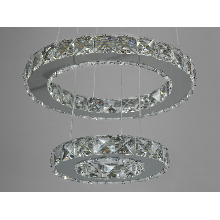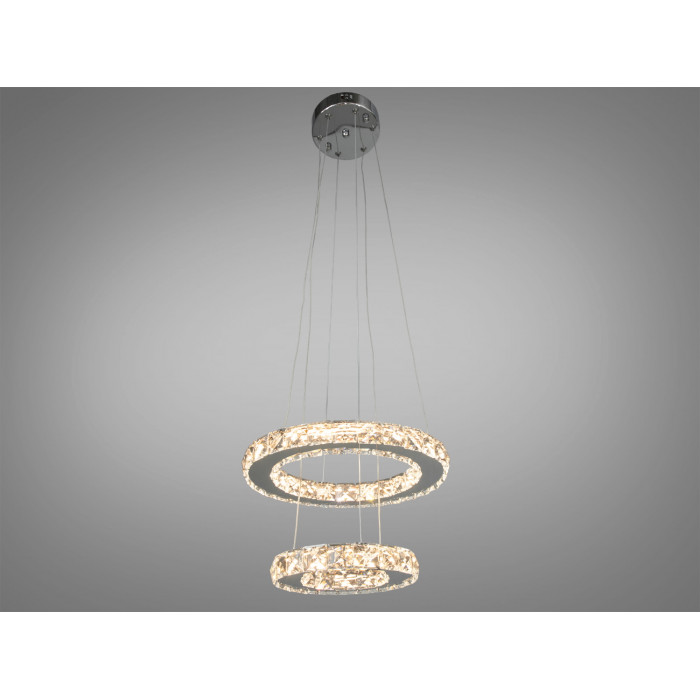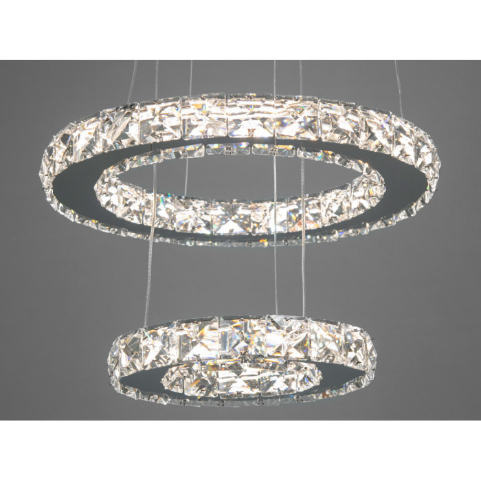 LED люстра підвіс "Кришталеві кільця" в вітальню від ТМ "Діаша", потужністю 30 Вт з хромованою основою. Ця елегантна підвісна люстра має два круглі кільця, які підвішені на тонких тросах, створюючи ефект легкості та невагомості. Кожне кільце обрамлене великими кришталевими елементами, які відбивають світло, створюючи приголомшливий ефект мерехтіння.
