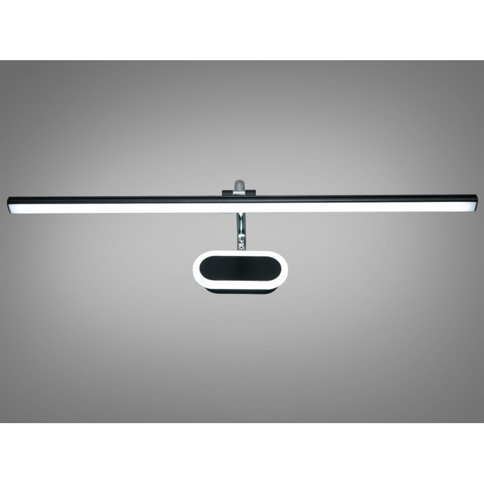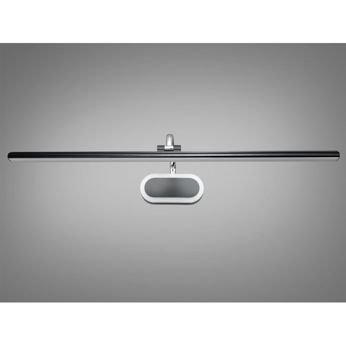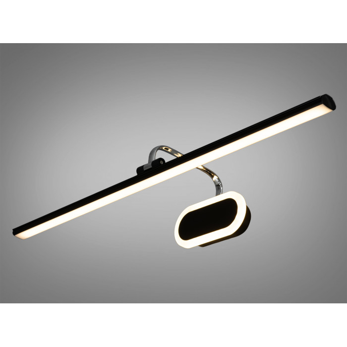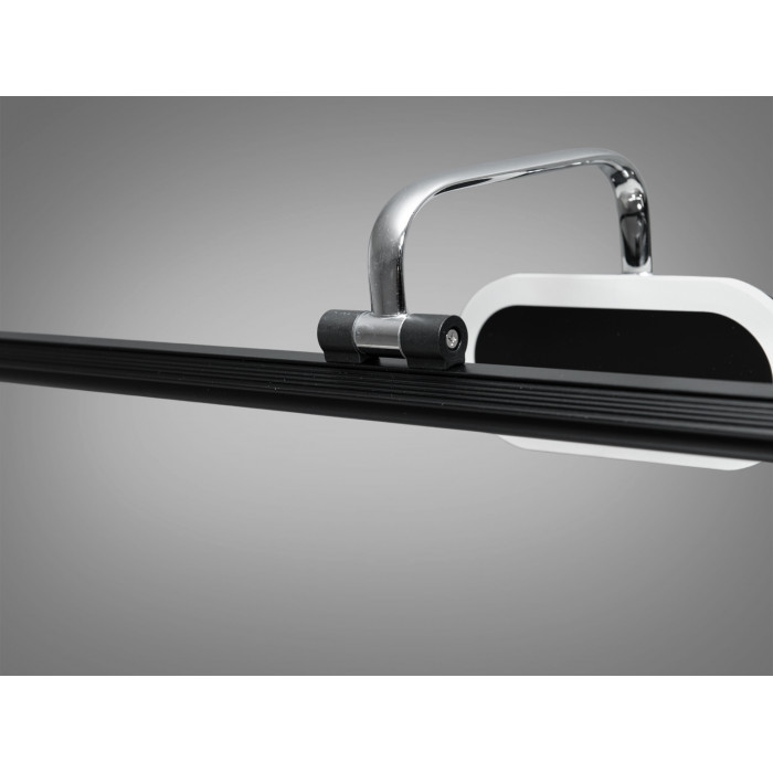 Чорний колір плафона, контрастуючи з хромованим тримачем, створює діалог між класикою та сучасністю, між стриманістю та блиском, який відображає світло в кожному кутку простору. Овальна металева основа, що підсвічується, виринає із темряви, немов мистецький об'єкт, зачаровуючи своєю простотою та комплексністю.
