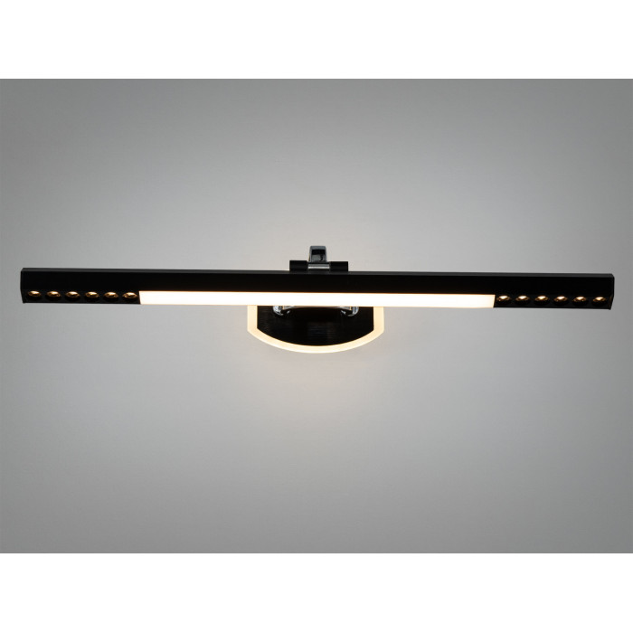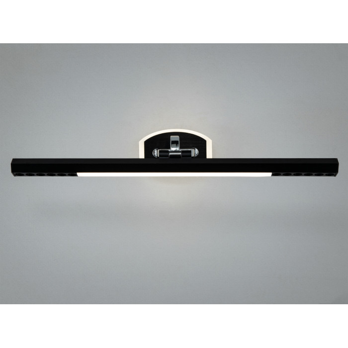Корпус настінної підсвітки виконано у чорному кольорі та має прямокутну форму, яка природно поєднується з мінімалістичними інтер’єрами, лофтом і скандинавськими рішеннями. Матовий розсіювач згладжує яскравість точок LED і створює м’яке, комфортне світло по всій довжині лінійки. Вбудована конструкція LED-модуля зменшує візуальну «вагу» світильника й допомагає зберегти охайний вигляд зони над дзеркалом або картиною.