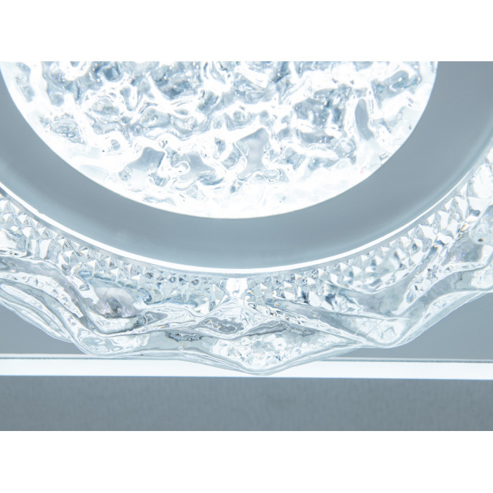 Модель має круглу форму з прозорою акриловою окантовкою та хвилястим візерунком у центрі. Така комбінація надає світильнику виразності та сприяє приємному розсіюванню потоку без різких тіней. Білий корпус гармонійно поєднується з сучасними інтер′єрами, а низький профіль робить пристрій доречним у приміщеннях з невисокими стелями. Закритий плафон допомагає зменшити потрапляння пилу та комах усередину, а гладкі поверхні легко очищуються м′якою сухою серветкою.