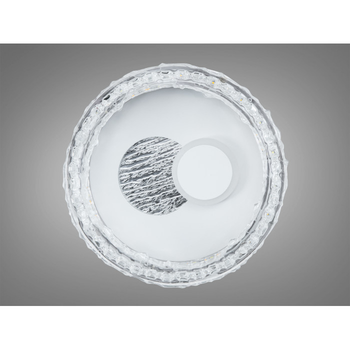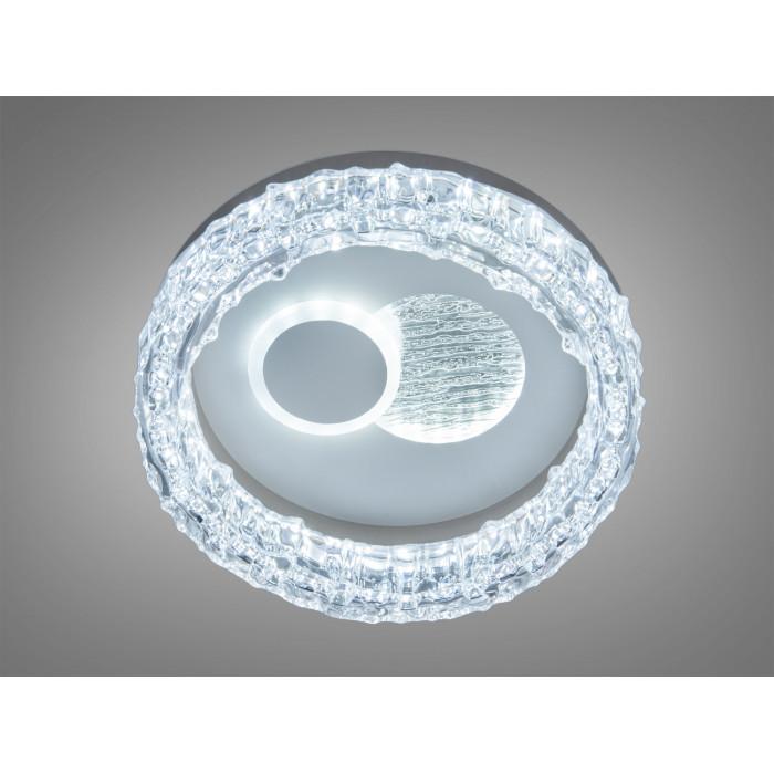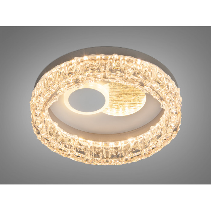 Компактний стельовий світлодіодний світильник у кольорі шампань створює м’яке загальне освітлення та візуально додає інтер’єру теплоти. Круглий корпус із прозорим акриловим обідком, що нагадує крижані кристали, і хвилястий візерунок у центрі підкреслюють сучасний стиль. Вбудовані LED-джерела сумарною потужністю близько 34 Вт забезпечують рівномірний світловий потік, якого зазвичай вистачає для невеликих приміщень площею до 6 м² за умови стандартних висот стель і світлих поверхонь.