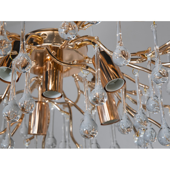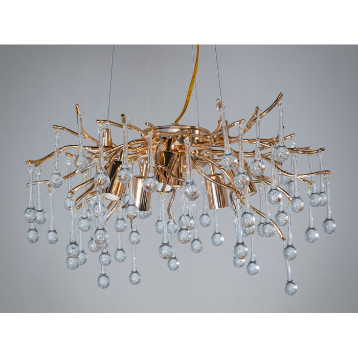 Елегантна кришталева люстра з серії "Гліцинія" захоплює своїм сучасним дизайном і вишуканістю. Виготовлена з хромованого алюмінію, вона прикрашена висячими скляними підвісками, що нагадують краплі дощу. Цей неймовірний елемент декору додає атмосферу розкоші у вашій вітальні або їдальні, перетворюючи світло в чарівну гру відблисків.