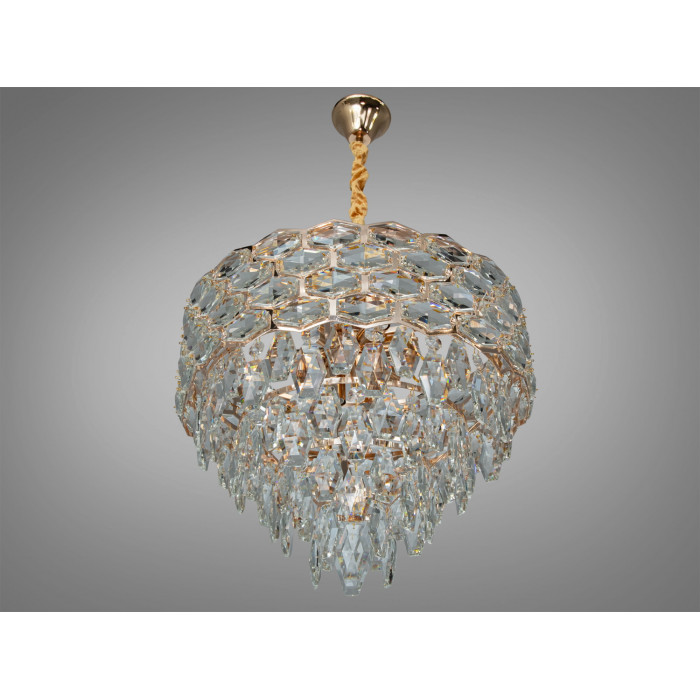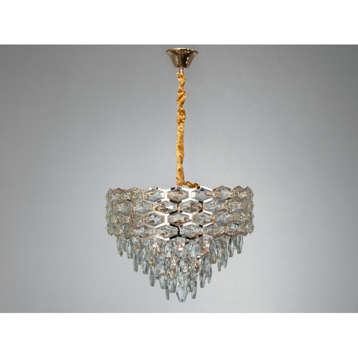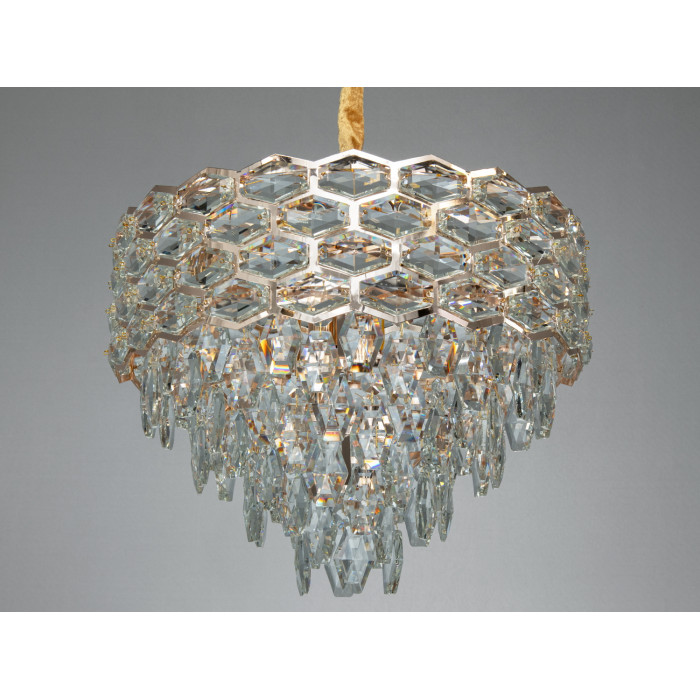 Люстра вирізняється щільною композицією з прозорих кришталевих елементів, які зібрані у геометрично вивірений контур. Каскад підвісок підсилює глибину світлової гри і додає об’єму. Золотисте кріплення утворює теплий відтінок відблисків і візуально «зігріває» простір. Шестикутна логіка рисунку помітна при огляді знизу: кришталь переломлює світло, створюючи виразний малюнок на поверхнях.