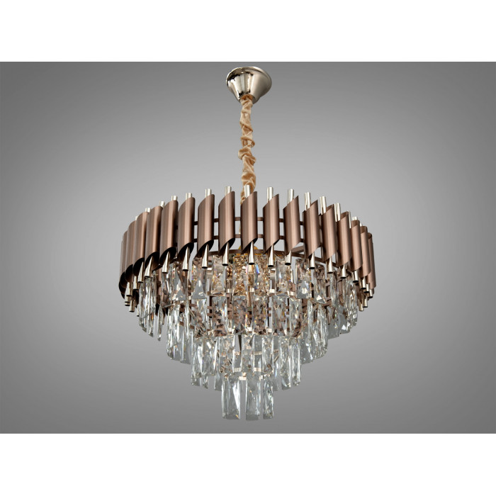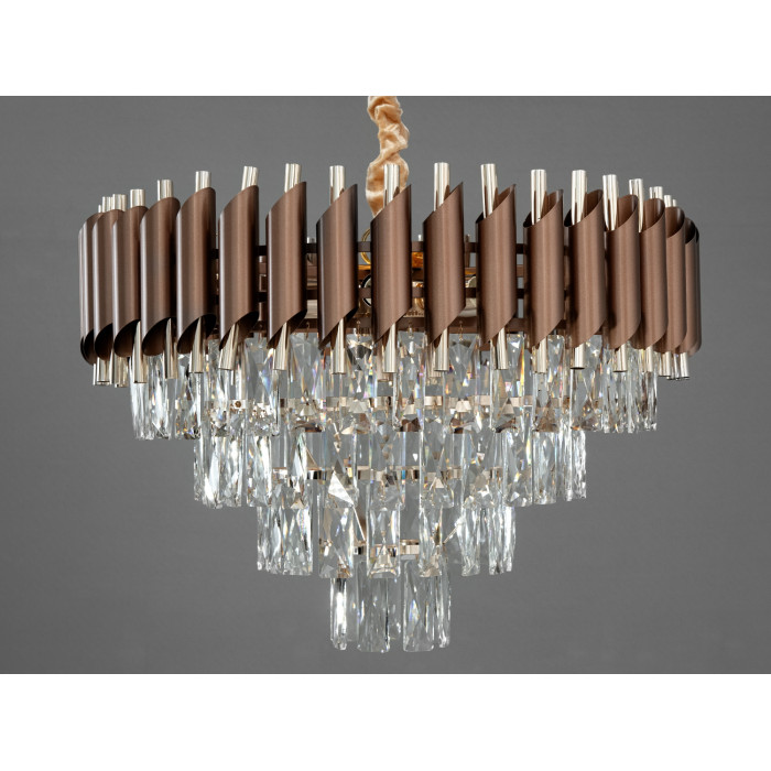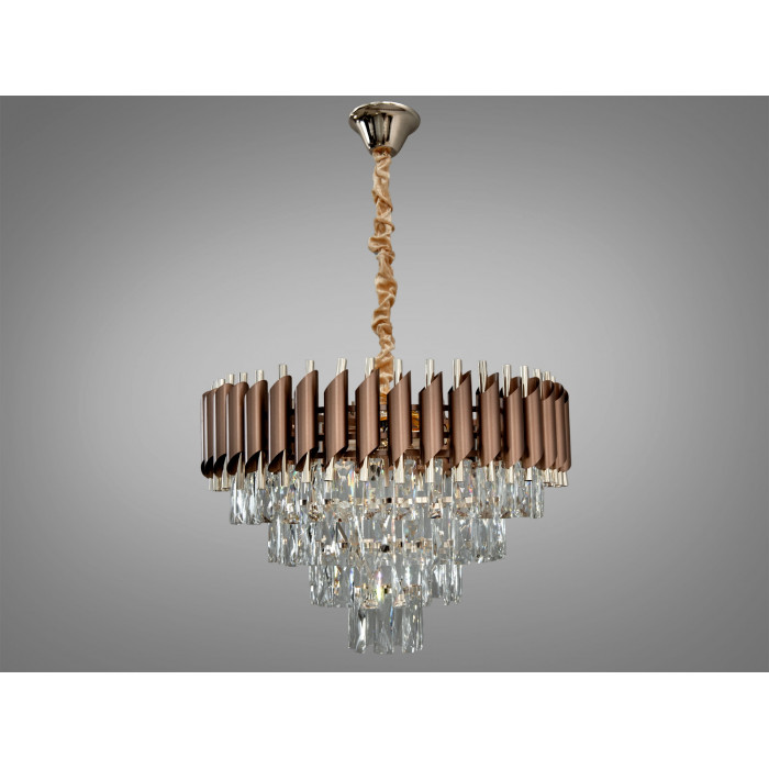 Підвісна кришталева люстра у кольорі коричневий та золото створює виразний акцент і м’яке багаторівневе світло. Дуга з металевих трубок, схожа на флейту Пана, формує зовнішній ряд зі скошених коричневих трубок та внутрішній ряд золотистих, між якими розміщені кришталеві підвіски. Така побудова підсилює розсіювання і гру відблисків у просторі, що особливо помітно у вітальнях і їдальнях з вищими стелями.