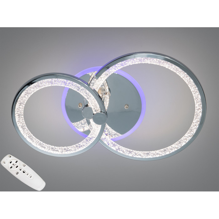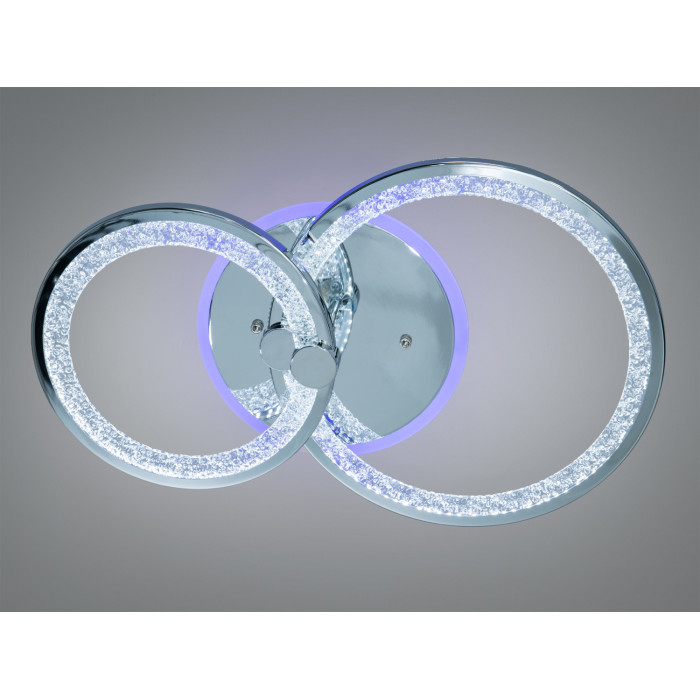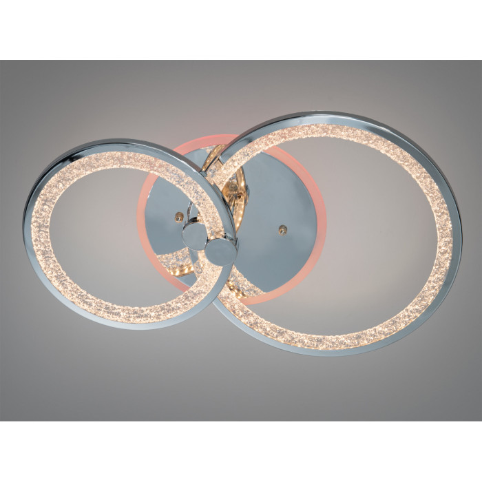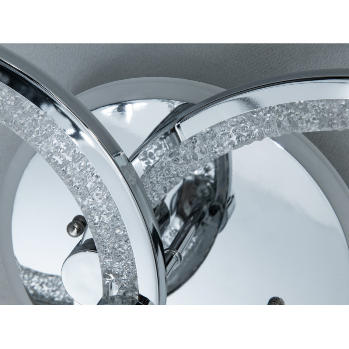 Головний акцент — два кільця, які виглядають лаконічно та підкреслюють геометрію простору. Хром надає поверхні дзеркального блиску, що візуально освіжає стелю і вписується у стилі modern, hi-tech та мінімалізм. Металевий каркас забезпечує жорсткість і стабільність, а акрилові дифузори рівномірно розсіюють світло без різких тіней, зменшуючи ефект сліпіння.