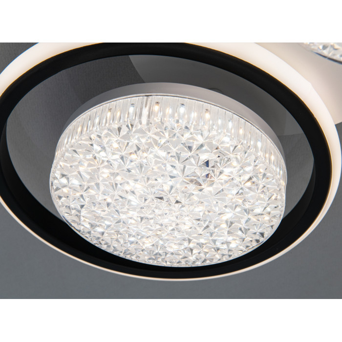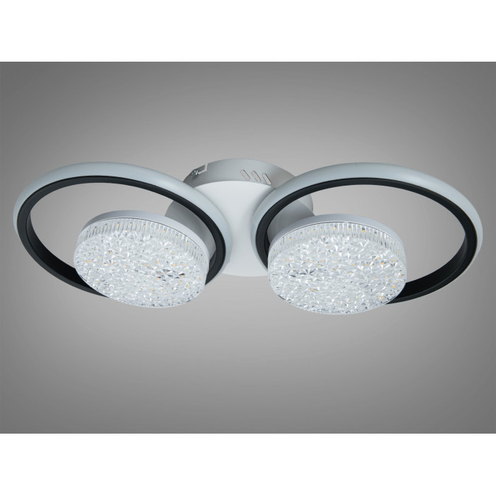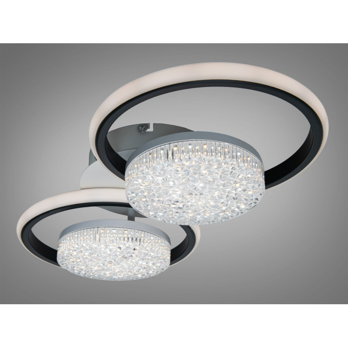 Світильник має металеву стельову основу та акрилові плафон-кольця з приємною для ока фактурою. Акрил забезпечує м’яке розсіювання світла без яскравих сліпучих зон, завдяки чому освітлення сприймається комфортно як для відпочинку, так і для роботи. Чотири кільця розміщені у композиції 2+2 — це допомагає краще покривати світлом площу кімнати і зменшує тіні.