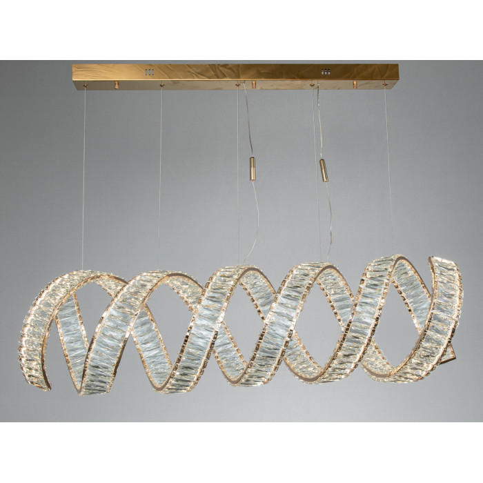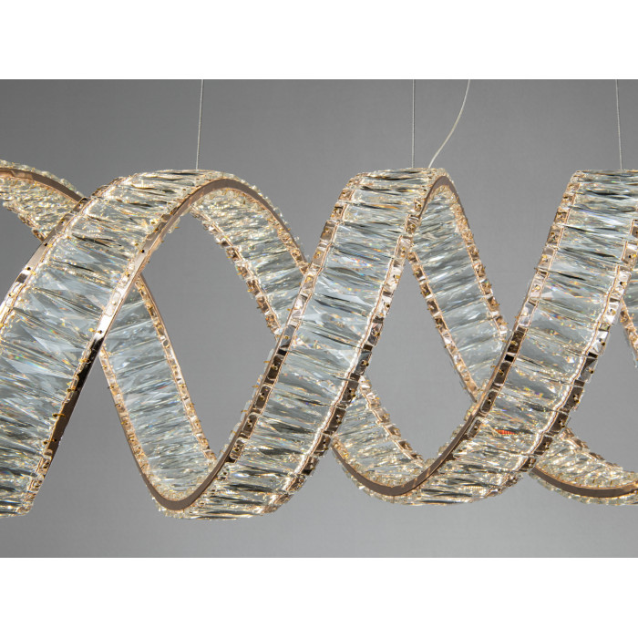 Конструкція базується на металевому кріпленні з підвісом на тонких тросах. Два овальні кільця утворюють спіральну композицію, а кришталеві вставки структурують світловий потік і підсилюють декоративний ефект без зайвого засліплення. Золотий колір гармонійно поєднується з деревом, каменем, світлими та темними відтінками оздоблення.