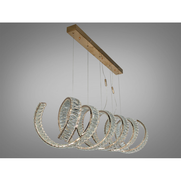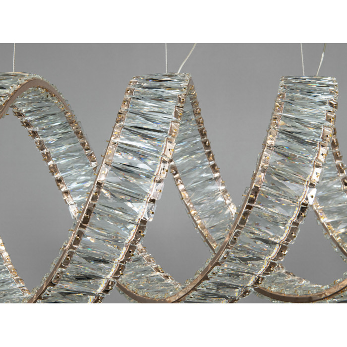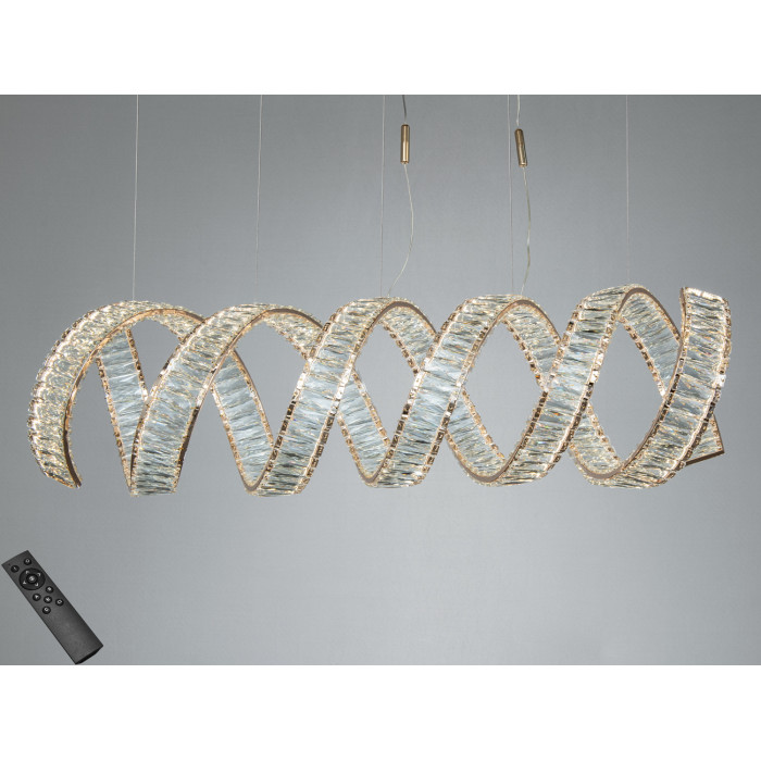 Кришталева LED люстра у формі спіралі з двома овальними кільцями — це виразний підвісний світильник для просторих інтер’єрів. Золотисте покриття, прозорі кришталеві елементи та підвіс на тонких тросах створюють легку, графічну композицію, яка привертає увагу з будь-якої точки кімнати. Завдяки потужності близько 250 Вт модель розрахована на якісне освітлення площі до 43 м², а пульт дистанційного керування додає зручності у щоденній експлуатації.