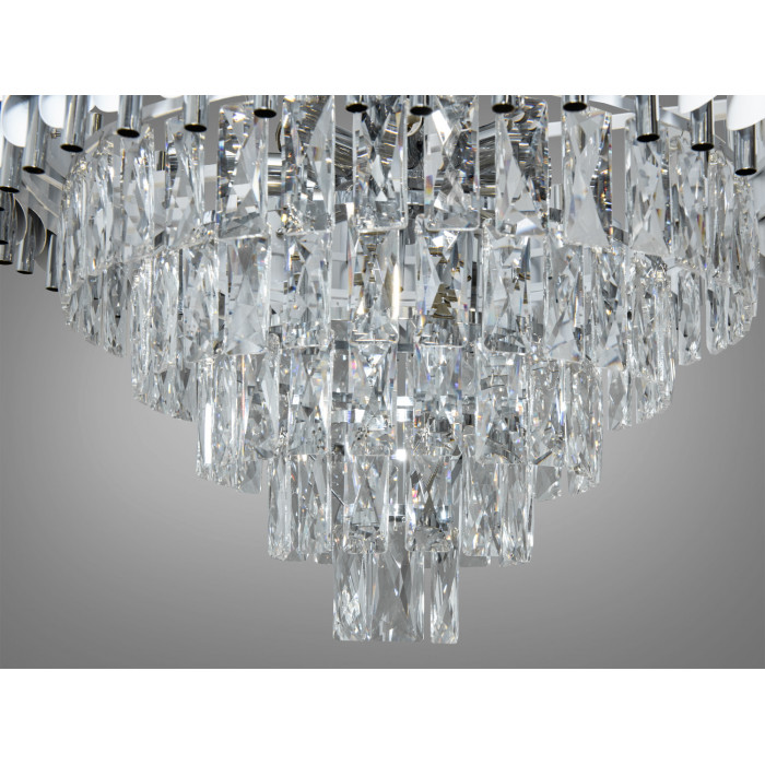 Каркас виконано з металу, що додає жорсткості конструкції та стабільності підвісу. Кришталеві елементи створюють виразний світловий малюнок і зберігають прозорість за умови простого догляду: періодичне протирання м’якою сухою серветкою та обробка антистатичним засобом допомагають мінімізувати осідання пилу.