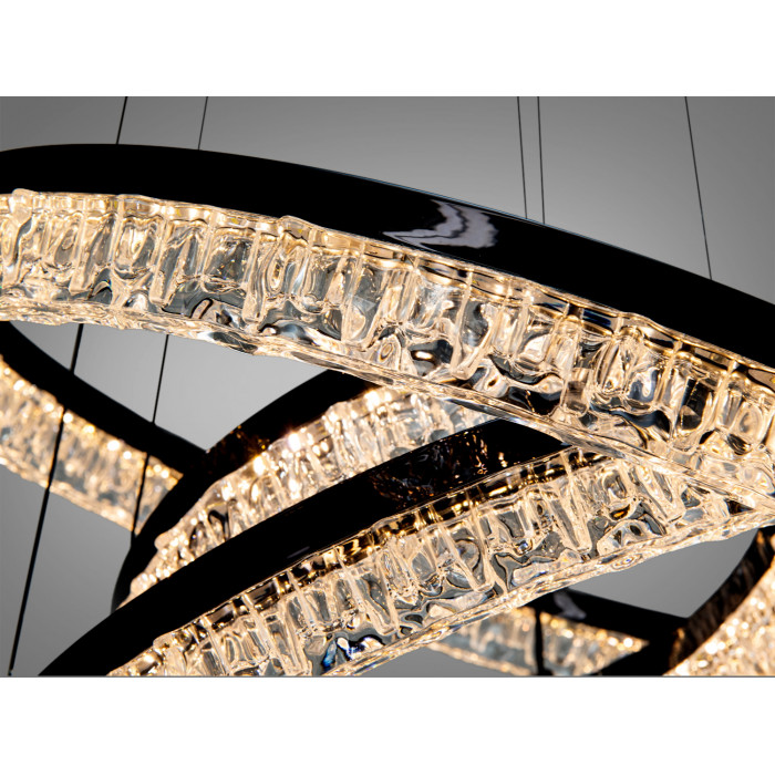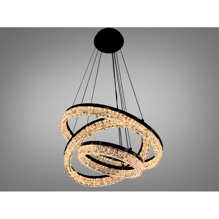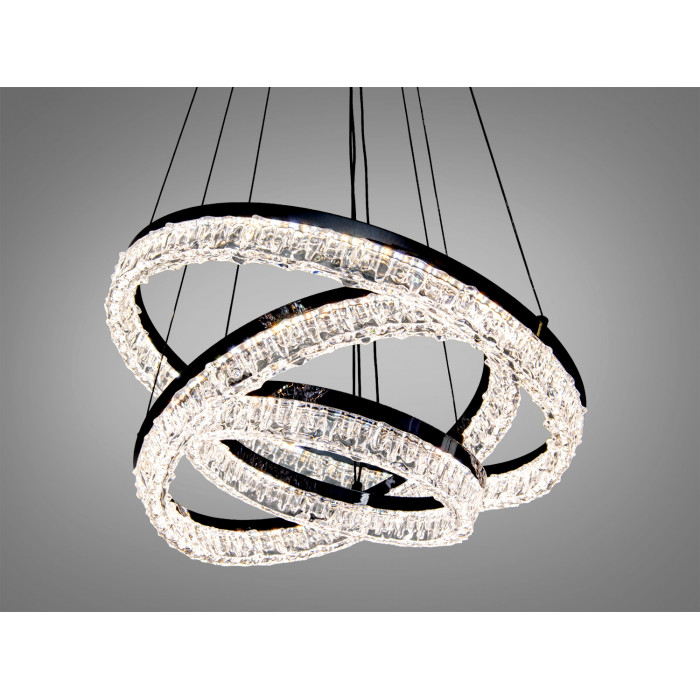 Підвісна кришталева світлодіодна люстра з пультом від Diasha створює виразний центральний акцент і комфортне базове освітлення. Модель у чорному кольорі поєднує три кільця різного діаметра та прозорі акценти, що надають світлу ефект кришталевого мерехтіння. Сумарна потужність 125 Вт забезпечує світловий потік, якого зазвичай достатньо для приміщень до 21 м², тож люстра пасує для вітальні, їдальні, простого холу або робочого кабінету.