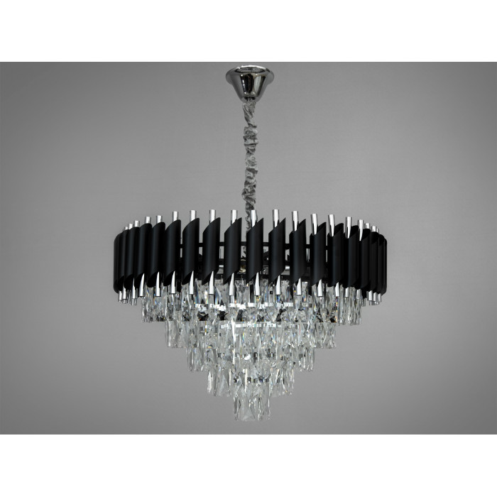 Візуальна багаторівневість конструкції підкреслює глибину простору: темні зовнішні пластини збирають силует, хром віддзеркалює промені, а кришталь додає сяйва без перевантаження. Такий підхід поєднує стриману геометрію з декоративністю, що припускає доречність у сучасній класиці, модерні та арт-деко.