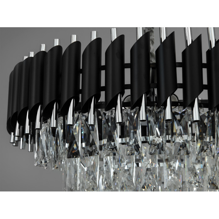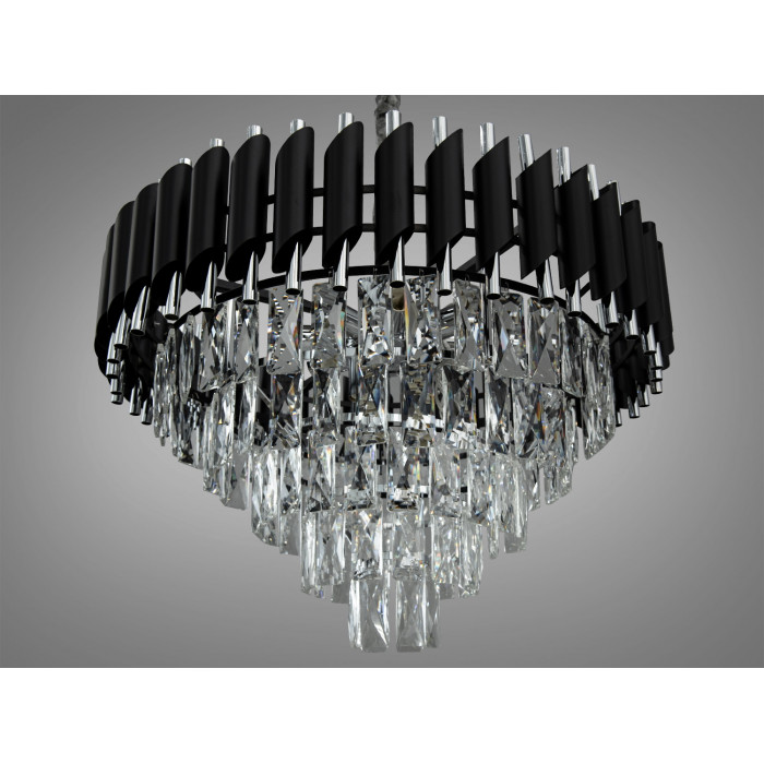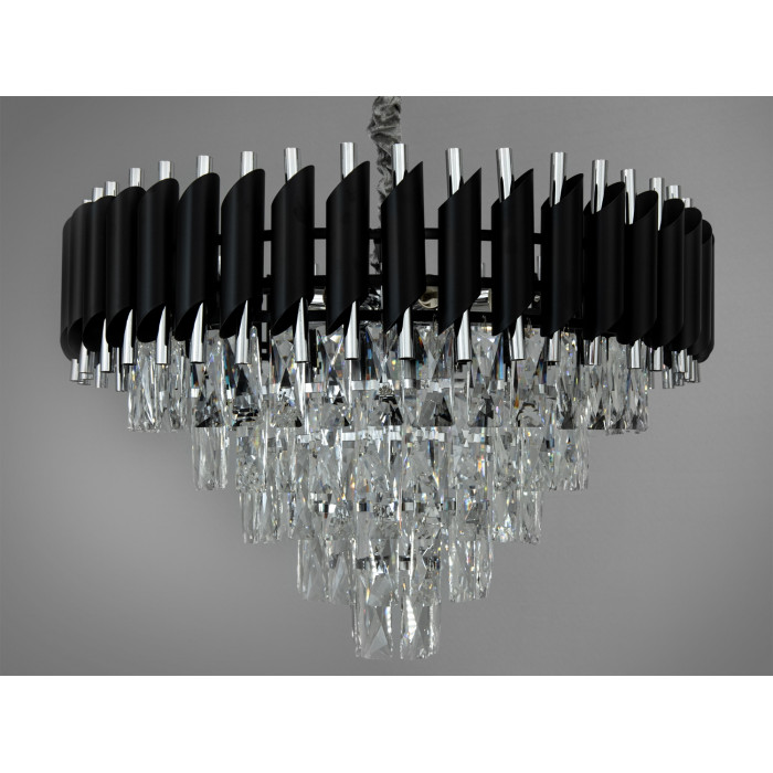 Підвісна кришталева люстра Diasha у кольорі чорний + хром створює виразний акцент і рівномірне освітлення приміщення до приблизно 20 м². Конструкція огорнута дугою з металевих трубок наче флейта Пана: верхні скошені елементи чорного кольору контрастують з внутрішніми хромованими трубками, а прозорі кришталеві підвіски формують каскад та характерний світловий малюнок. Модель належить до класичних хрустальних люстр та представлена в серії 1013.