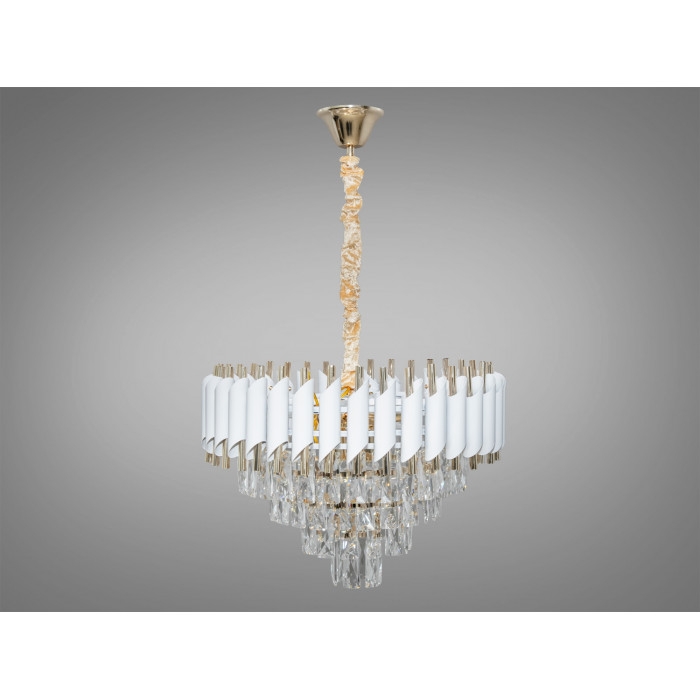 Металевий каркас забезпечує жорсткість і довговічність, а поєднання білого та золотистого покриття додає акценту без перевантаження простору. У догляді достатньо періодично протирати елементи м’якою сухою серветкою; для кришталю бажано використовувати засоби без абразивів.