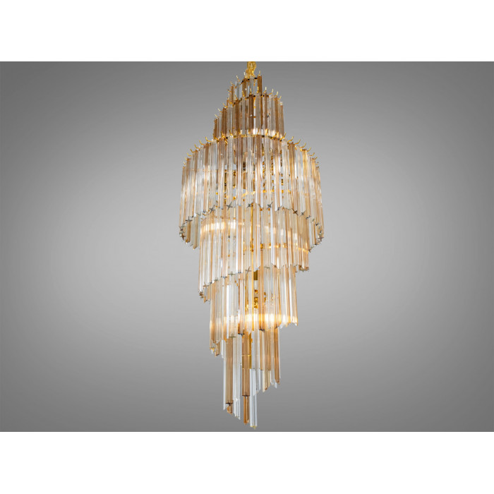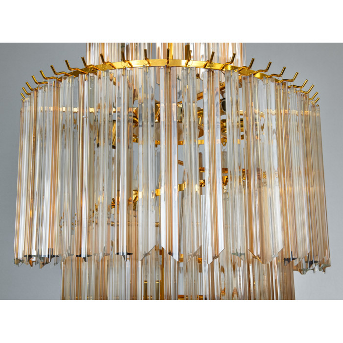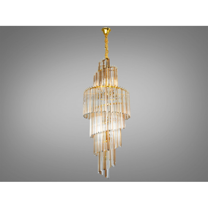 Багатоярусна композиція з прозорих кришталевих трубок утворює вертикальний каскад, який виглядає виразно у високих приміщеннях. Теплий золотоносний тон фурнітури поєднується з холодним блиском кришталю, тож люстра органічно виглядає як у класичних, так і в сучасних просторах. Згідно з маркуванням моделі, орієнтовний діаметр становить близько 600 мм, а висота підвісу — до 1500 мм, що дає змогу ефектно розкрити каскад у холах, вітальнях та на сходових маршах.