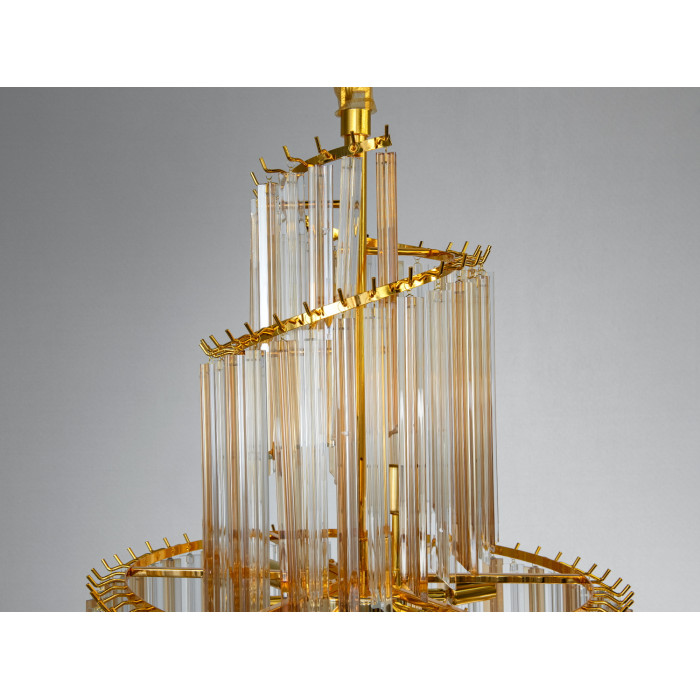 Ця підвісна кришталева люстра створена для інтер’єрів, де світло відіграє роль головного декоративного елемента. Багаторівневий каскад прозорих трубчастих підвісок формує м’яке сяйво та ефект об’ємного світлового потоку. Золотисте покриття металевого каркаса додає моделі теплий відтінок та підкреслює глибину кришталевих граней, що особливо помітно у вечірньому освітленні.