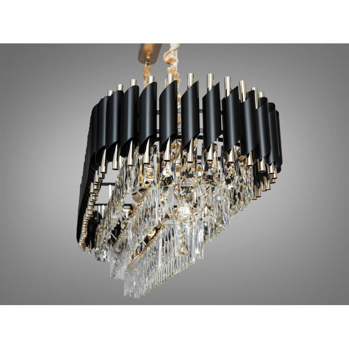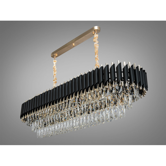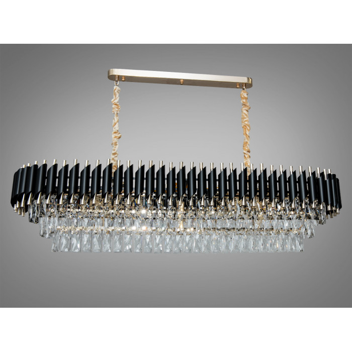 Артикул 9001-1200X350BK+SGD — підвісна кришталева люстра овальної форми з подовженим корпусом приблизно 1200 × 350 мм. Поєднання чорного металу з золотими акцентами та прозорих кришталевих елементів створює виразну світлотінь та підкреслює лінію столу або зони відпочинку. Модель відноситься до Серії 1013 і орієнтована на встановлення над обідніми столами, кухонними островами чи у просторих вітальнях, де потрібне спрямоване та рівномірне освітлення.