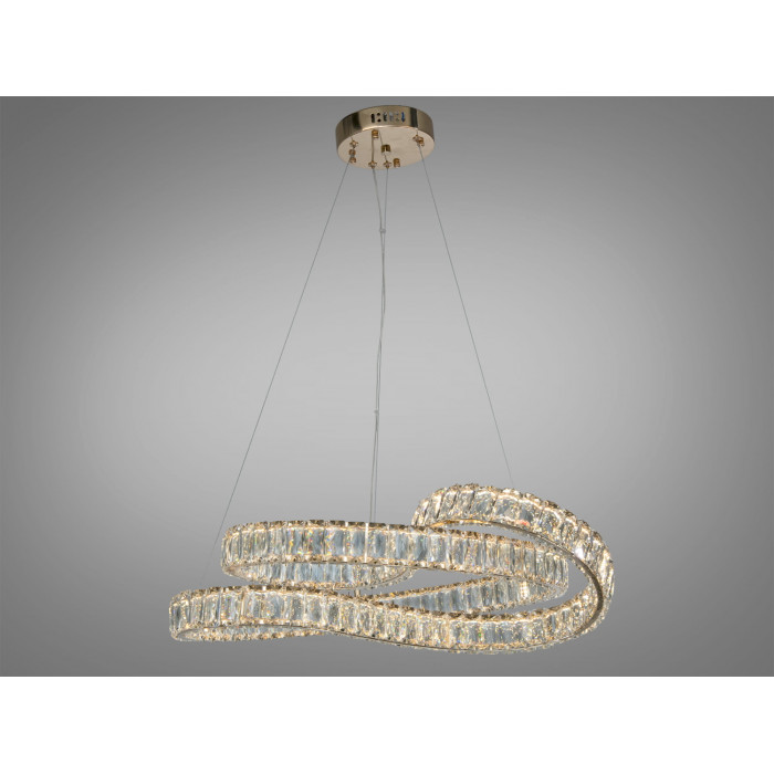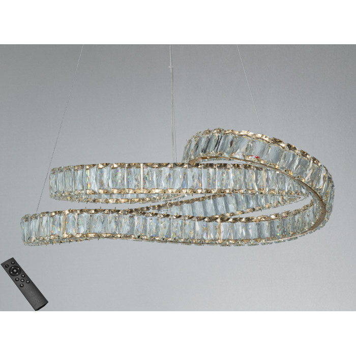 Кришталева LED люстра у підвісному виконанні створює виразний світловий акцент і м’яко підкреслює геометрію простору. Модель у золотому кольорі поєднує металеву основу та кришталеві елементи, що формують спіральну композицію з одним або кількома кільцями на тросах. Завдяки потуужності до 85 Вт освітлення передбачає комфортний рівень яскравості для приміщень орієнтовно до 15 м², а комплектний пульт ДК дає можливість регулювати світло під задачі кімнати.
