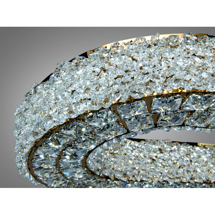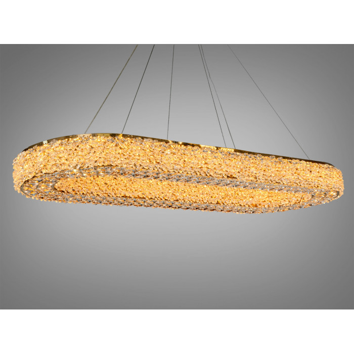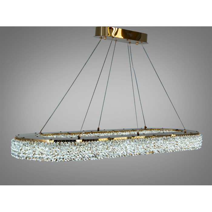 Овальна кришталева люстра з підвісним монтажем створює візуально м’яке, тепле світло і підкреслює геометрію простору над обіднім столом чи у центрі вітальні. Модель комплектується дистанційним керуванням та використовує LED-джерела потужністю близько 84 Вт, чого зазвичай достатньо для освітлення приміщення до 14 м². Золотисте покриття металевої основи поєднується з прозорими кришталевими елементами, які заломлюють і підсилюють світловий потік, формуючи виразну світлотіньову гру.
