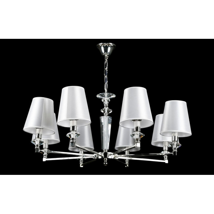 Стиль:Люстры с абажурамиВысота, см:50-90Диаметр, см:85Количество ламп:8MAX мощность лампы, Вт:40Напряжение, В:220Патрон:Е14Цвет:хром, белый.Материал:металл, хрусталь, тканьПроизводитель:Splendid Ray(Китай)Дополнительная информация:Тип крепления:на крючок
