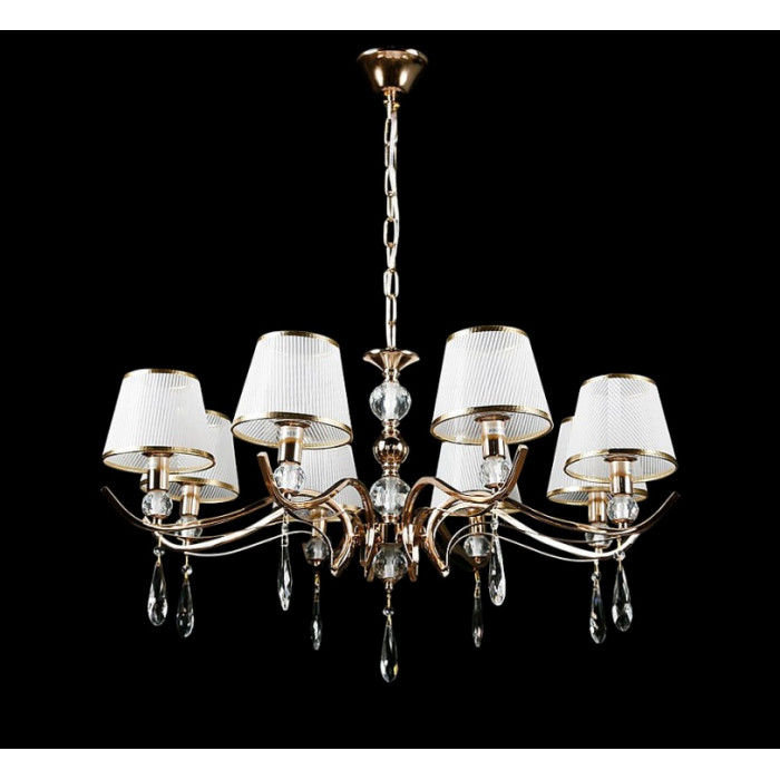 Стиль:Люстры с абажурамиВысота, см:60-95Диаметр, см:82Количество ламп:8MAX мощность лампы, Вт:40Напряжение, В:220Патрон:Е14Цвет:золото, белый.Материал:металл, ткань, хрустальПроизводитель:Splendid Ray(Китай)Дополнительная информация:Тип крепления:на крючок