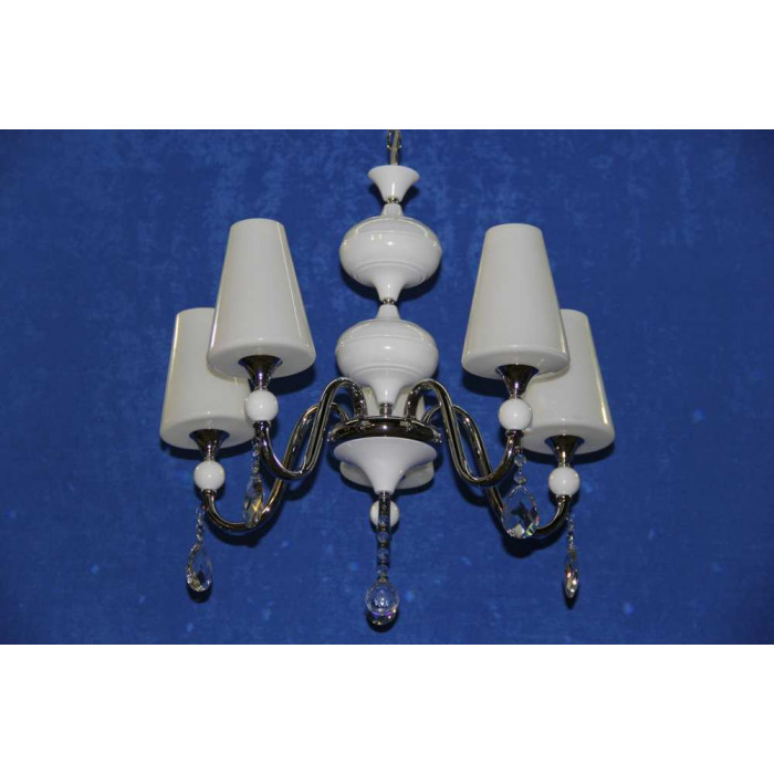 Стиль:Люстры с плафонамиВысота, см:70Диаметр, см:60Количество ламп:5MAX мощность лампы, Вт:40Напряжение, В:220Патрон:Е14Цвет:Хром,белый.Материал:Металл,стекло,хрусталь.Производитель:Splendid Ray(Китай)Дополнительная информация:Тип крепления:на крючок