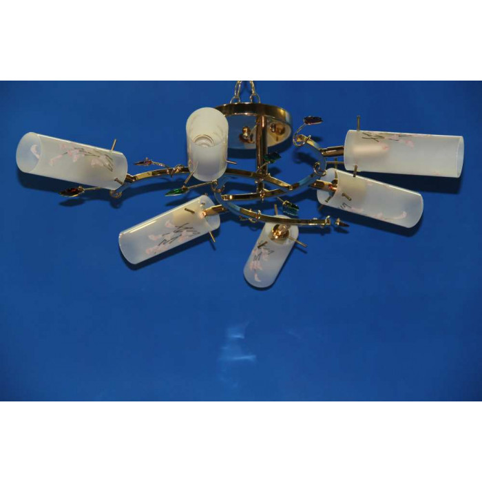 Стиль:Люстры с плафонамиВысота, см:15Диаметр, см:65Количество ламп:6MAX мощность лампы, Вт:40Напряжение, В:220Патрон:Е27Цвет:золото,белый,зеленый,коричневыйМатериал:металл,стеклоПроизводитель:Splendid Ray(Китай)Дополнительная информация:поворотные плафоныТип крепления:на кронштейн