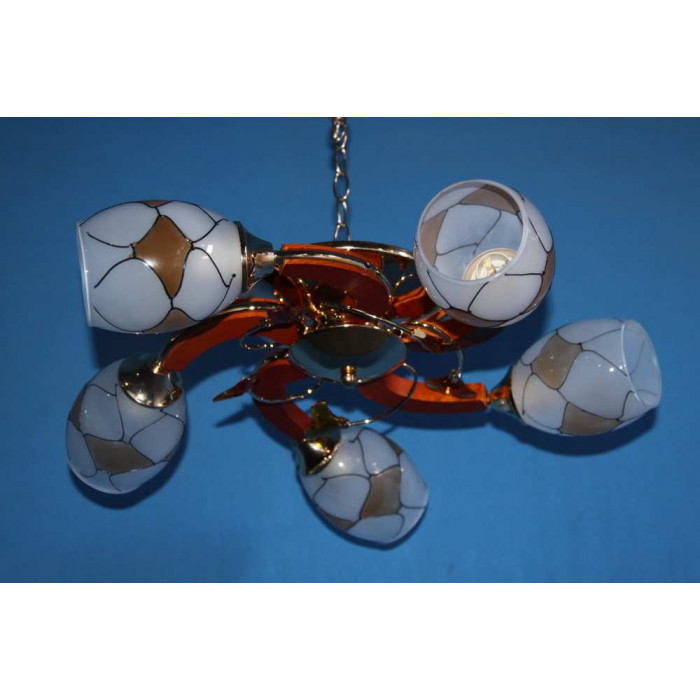 Стиль:Люстры с плафонамиВысота, см:16Диаметр, см:62Количество ламп:5MAX мощность лампы, Вт:40Напряжение, В:220Патрон:Е14Цвет:золото, белый, коричневыйМатериал:металл, стекло, деревоПроизводитель:Splendid Ray(Китай)Дополнительная информация:Тип крепления:на кронштейн
