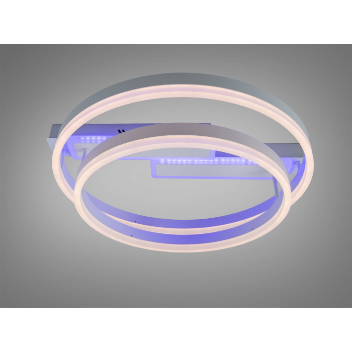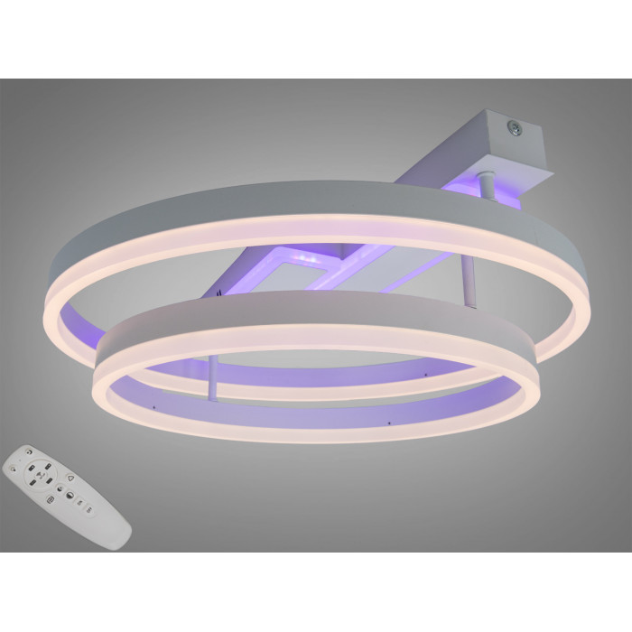 Ця модель позиціонується як потолочна LED-люстра з пультом, димером та триколірною підсвіткою основи. Поєднання двох кілець забезпечує впізнаваний силует, а білий колір підкреслює акуратність і легкість форми. Якщо шукаєте кероване світло для щоденної рутини та затишних вечорів, ця люстра може стати вдалим рішенням для вашого простору.