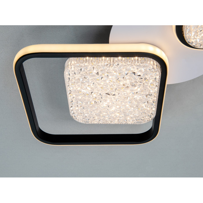 Люстра виконана у лаконічному стилі з поєднанням білого й чорного кольорів. Такий контраст підкреслює геометрію модулів і добре поєднується з мінімалістичними та сучасними інтерʼєрами. Низький профіль зручний для приміщень зі стандартною та невисокою стелею. Світлові елементи закриті акриловими розсіювачами, які помʼякшують випромінювання та зменшують ймовірність сліпіння. Монтаж — накладний на стелю; формат підходить для квартир, приватних будинків і офісів.
