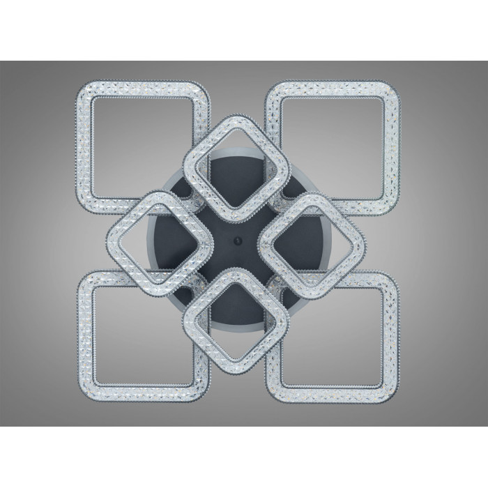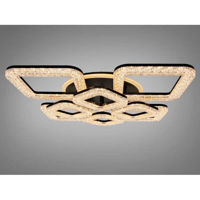 Композиція побудована на кристалічному ефекті прозорих квадратів та лаконічній чорній основі. Акрилові розсіювачі мають гранчасту структуру, що на вигляд нагадує кришталеві вставки та сприяє рівномірному розподілу світла. Така конструкція зазвичай дає приємні відблиски без жорстких тіней, а невелика висота корпусу робить модель доречною навіть у кімнатах із стандартною стелею.