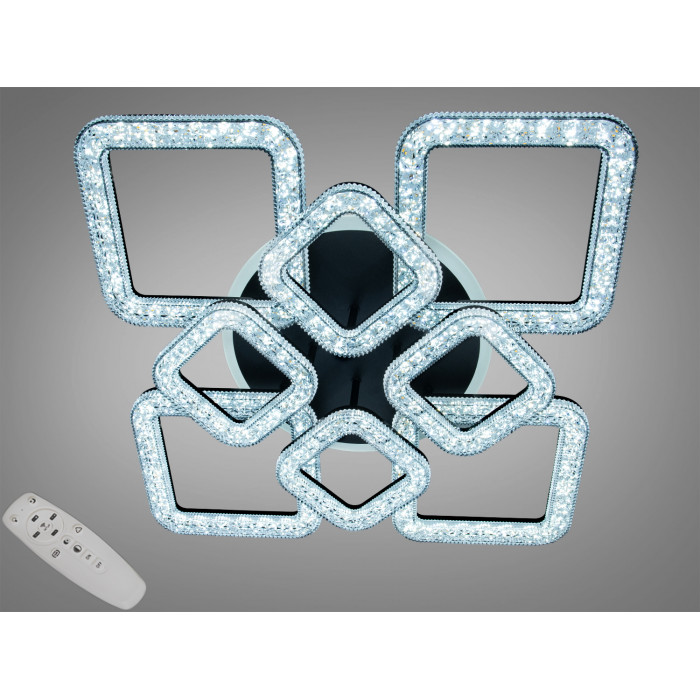 Квадратні та ромбоподібні контури цієї моделі формують впізнаваний графічний образ, що легко поєднується з сучасними інтерʼєрами. Люстра монтується впритул до стелі, а чорна основа вигідно підкреслює прозорі квадратні елементи з акрилу, які створюють мʼяке, комфортне світло. У комплектації передбачено пульт дистанційного керування, що спрощує щоденне користування.