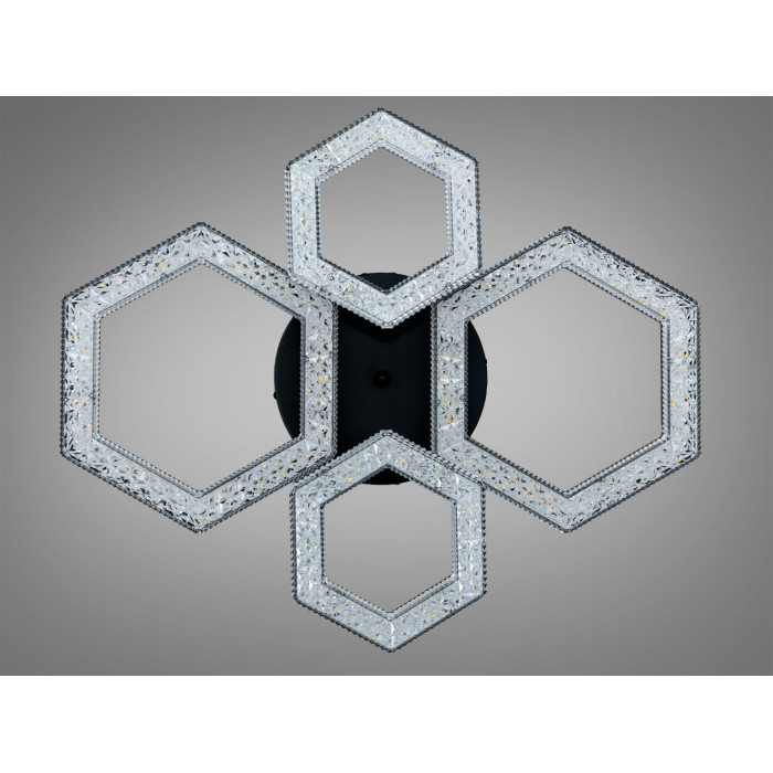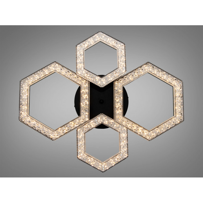Композиція з чотирьох шестикутників виглядає лаконічно і водночас помітно. Чорний металевий каркас утворює чіткий силует, а акрилові плафони забезпечують м’яке і рівномірне розсіювання. Такий підхід дає змогу отримати комфортну яскравість без зайвих відблисків на глянцевих поверхнях.