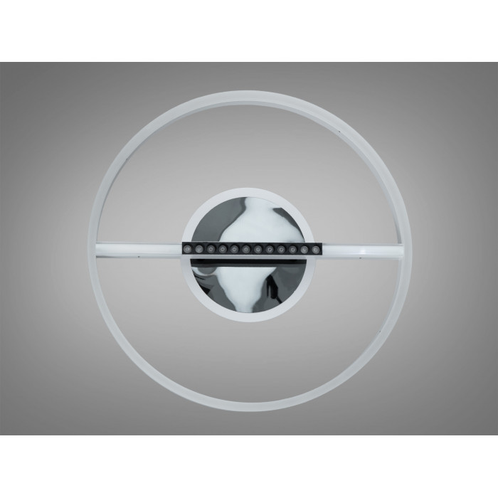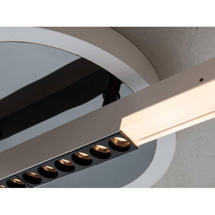 Лаконічна кругла форма з білим корпусом і чорним обрамленням підтримує інтер’єри в сучасних стилях. Центральний дзеркальний елемент додає глибини та підкреслює геометрію плафона, створюючи привабливий візуальний акцент на стелі. Завдяки нейтральній гаммі люстра поєднується як із світлими, так і з контрастними кольорами стін та меблів.
