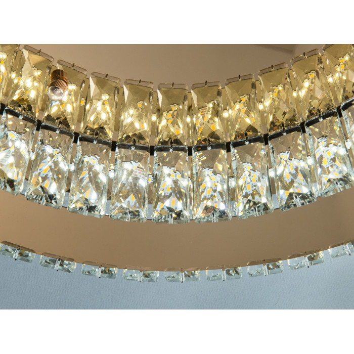 Лаконічний круглий контур, м’який блиск кришталю та теплий відтінок металу утворюють продуману композицію. Кристали розсіюють світло, створюючи м’які відблиски без різких переходів. Металевий корпус із золотистим тоном візуально «підсвічує» інтер’єр, а низький профіль не «краде» висоту. Така геометрія гарно поєднується з меблями з теплими текстурами дерева, текстилем нейтральних кольорів або латунними деталями декору.
