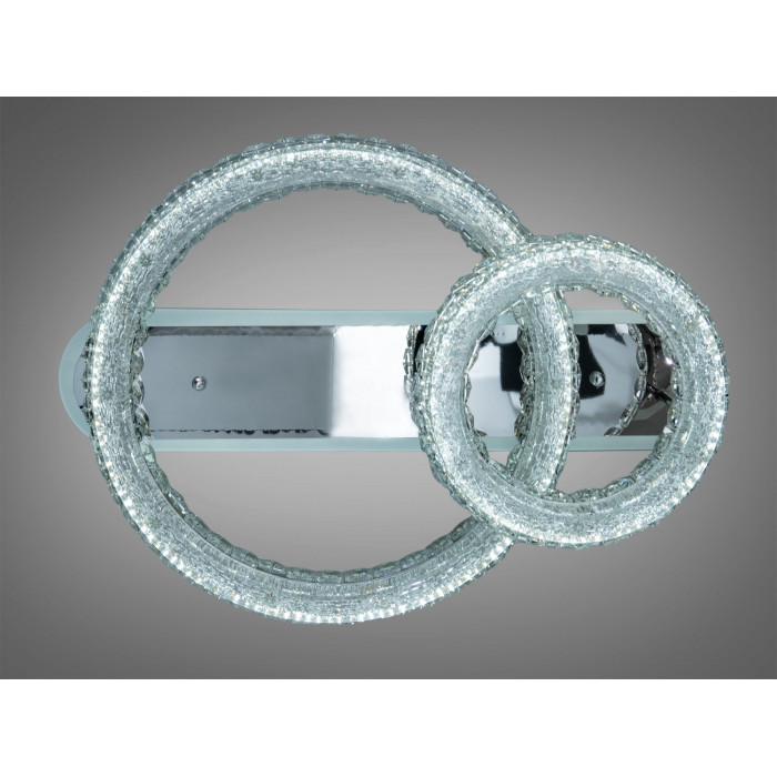 Два кільця, що ніби «пливуть» одне крізь одне, формують сучасний силует і підкреслюють архітектуру простору. Прозорі елементи з кришталевим ефектом вловлюють відблиски і м’яко підсилюють світловий потік, а металева основа з хромовим покриттям гармонійно поєднується з холодними і теплими палітрами інтер’єру. Низький профіль монтажу робить люстру доречною навіть у кімнатах зі стандартною висотою стелі.