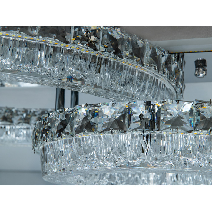 Ця стельова LED кришталева люстра у хромі може стати центральним світловим акцентом у сучасному просторі. Поєднання двох світлових модулів, дистанційного керування та візуальної легкості прозорих елементів допомагає досягнути комфортного та виразного освітлення без перевантаження інтер’єру.