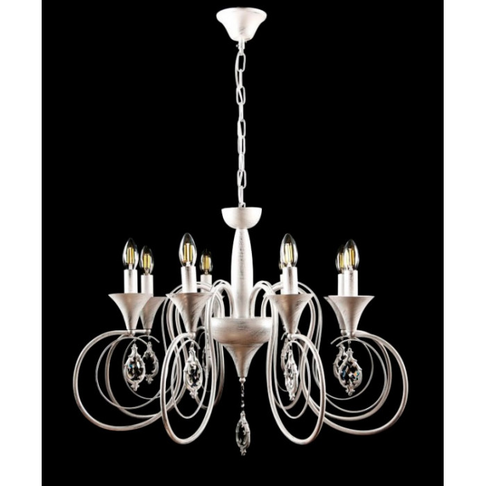 Стиль:Люстры свечиВысота, см:100Диаметр, см:75Количество ламп:8MAX мощность лампы, Вт:40Напряжение, В:220Патрон:Е14Цвет:белый, серебро.Материал:металл, хрустальПроизводитель:Splendid Ray(Китай)Дополнительная информация:Тип крепления:на крючок
