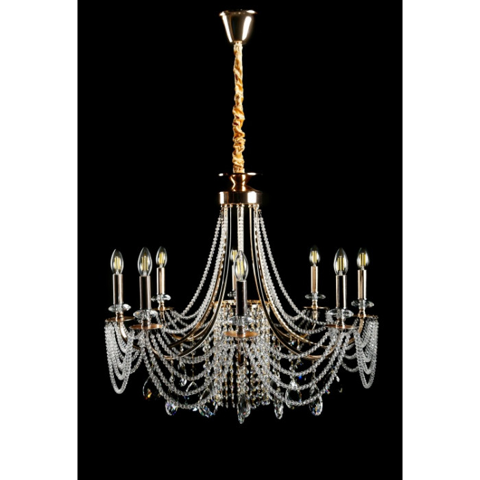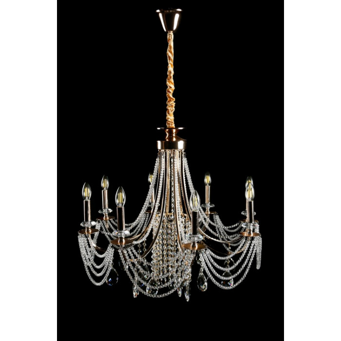 Стиль:Люстры свечиВысота, см:68-110Диаметр, см:75Количество ламп:8MAX мощность лампы, Вт:40Напряжение, В:220Патрон:Е14Цвет:золото, белый.Материал:металл, хрустальПроизводитель:Splendid Ray(Китай)Дополнительная информация:Тип крепления:на крючок