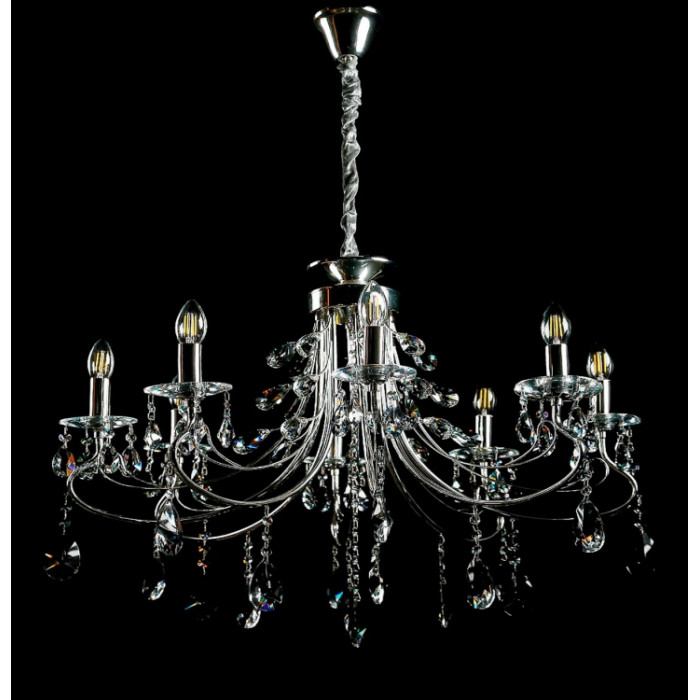 Стиль:Люстры свечиВысота, см:75-115Диаметр, см:80Количество ламп:10MAX мощность лампы, Вт:40Напряжение, В:220Патрон:Е14Цвет:хром, белый.Материал:металл, хрустальПроизводитель:Splendid Ray(Китай)Дополнительная информация:Тип крепления:на крючок
