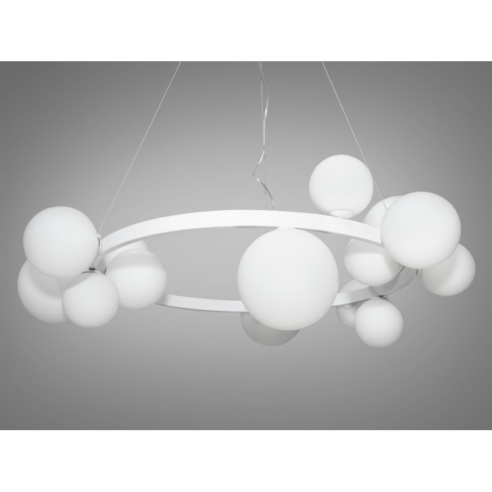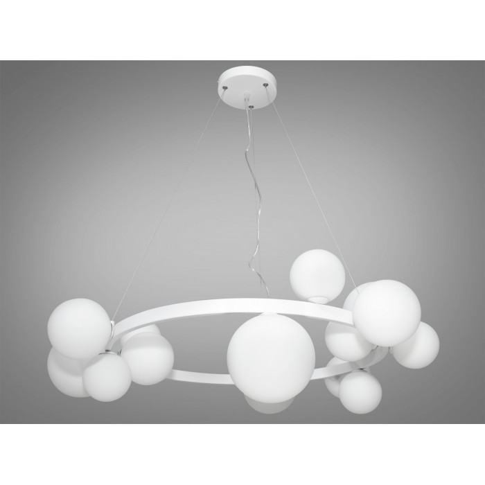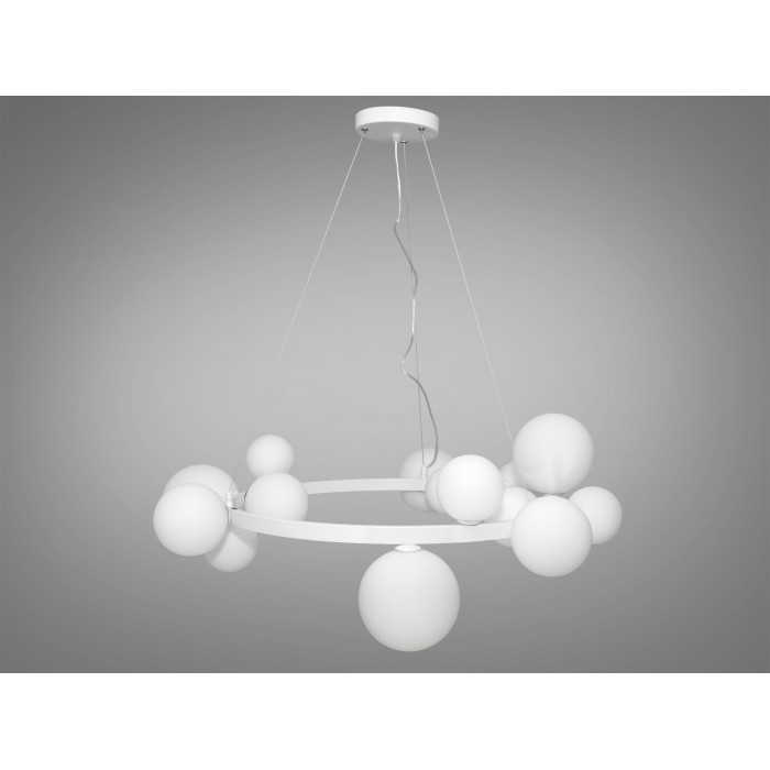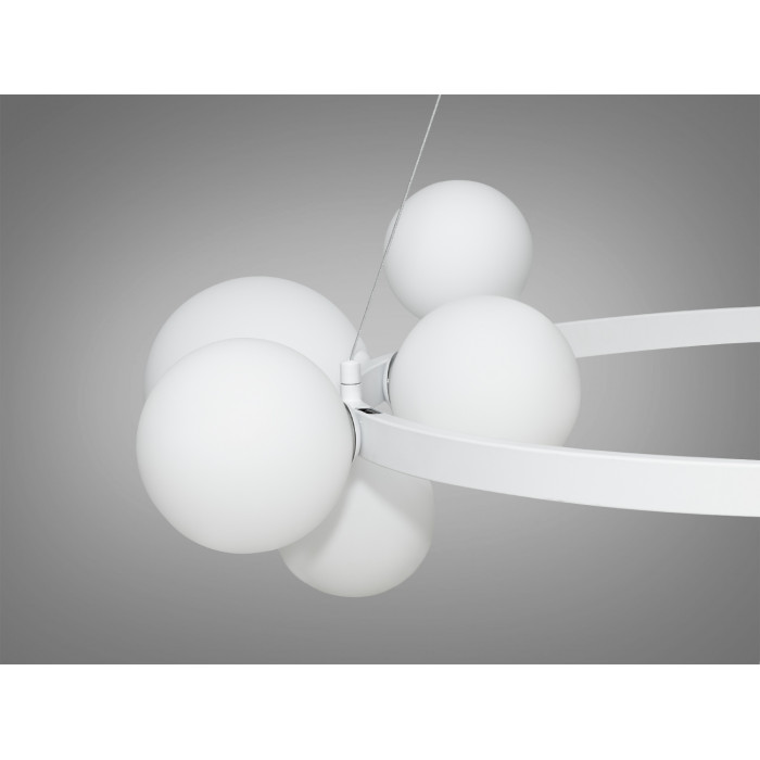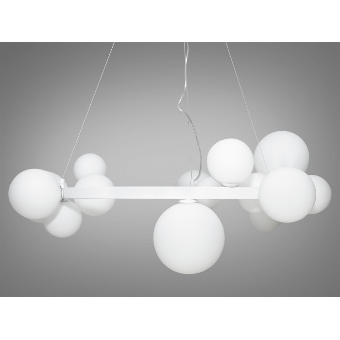 Одним із ключових елементів дизайну є скляні плафони білого матового кольору, що нагадують бульбашки. Ці плафони виконані у різних розмірах і кріпляться асиметрично, що надає люстрі унікальності та характеру. Різні розміри бульбашок створюють неповторний інтер'єрний акцент.