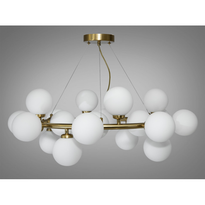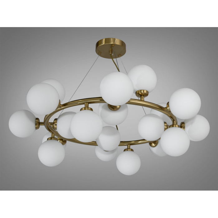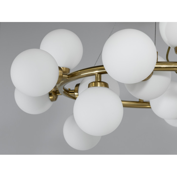 Конструкція люстри складається з масивного бронзового кільця, до якого хаотично прикріплені двадцять матових білих куль, формуючи органічний та динамічний вигляд. Візуальна легкість плафонів контрастує з міцністю бронзової основи, надаючи цій люстрі сучасного та стильного вигляду.