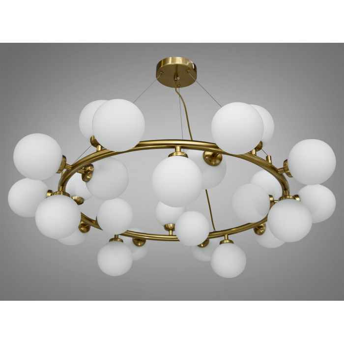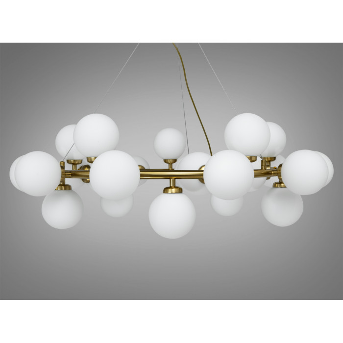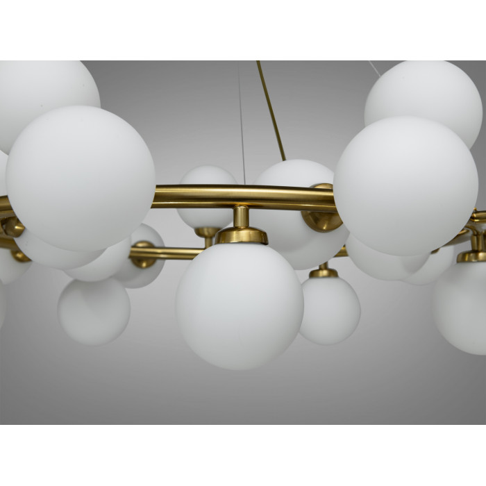 Конструкція люстри складається з масивного бронзового кільця, до якого хаотично прикріплені двадцять п’ять куль, формуючи органічний та динамічний вигляд. Візуальна легкість плафонів контрастує з міцністю бронзової основи, надаючи цій люстрі сучасного та стильного вигляду.
