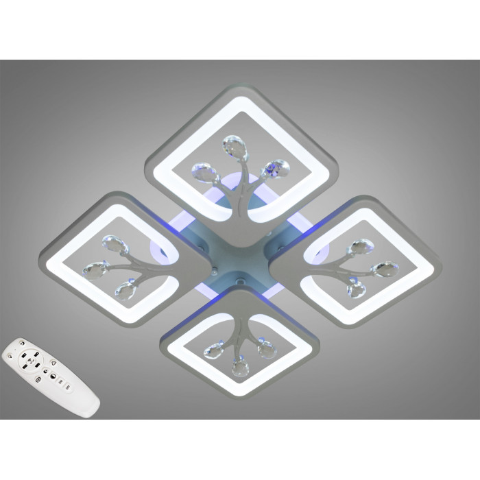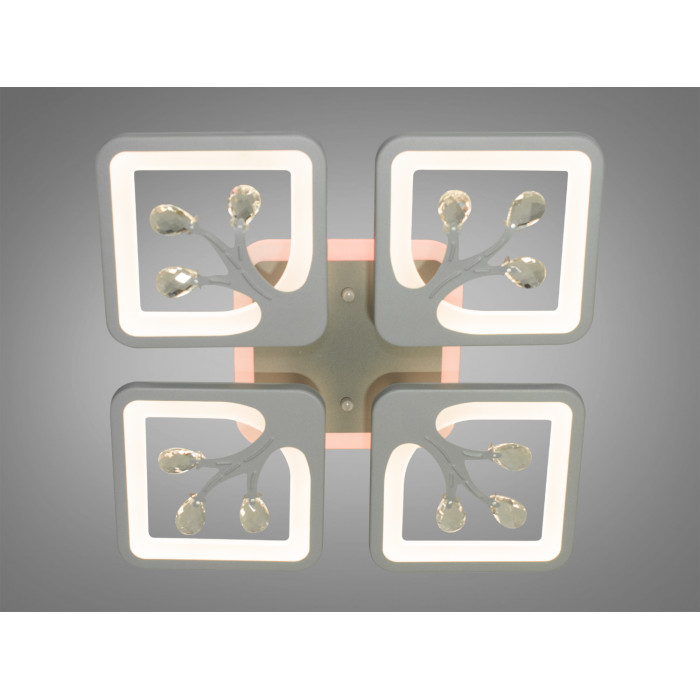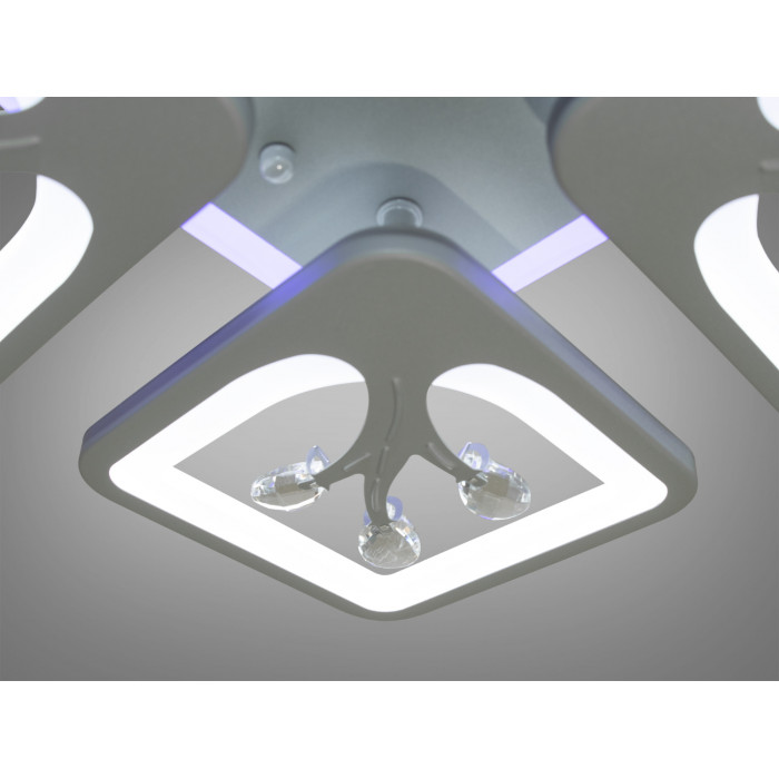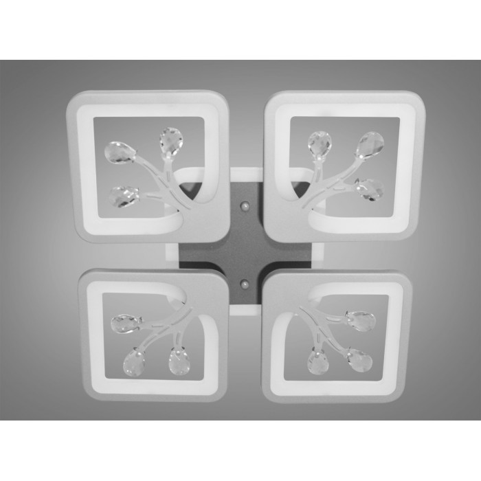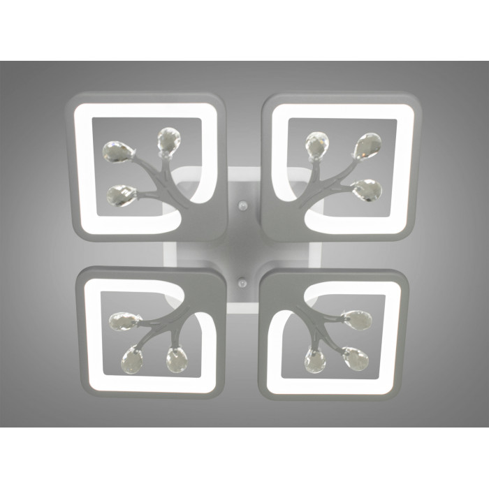 Наша гармонійна світлодіодна люстра для кухні, яка має чотири квадратних елементи, організовані навколо центральної точки, що створює враження симетричної композиції. Кожен квадрат має внутрішній світлодіодний контур, що надає конструкції візуальної легкості та сучасної естетики. Між цими рамками розташовані гілки з кришталевими кульками на кінцях, які відбивають світло, створюючи гру світла та тіні, нагадуючи зірки на нічному небі.