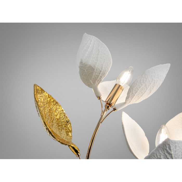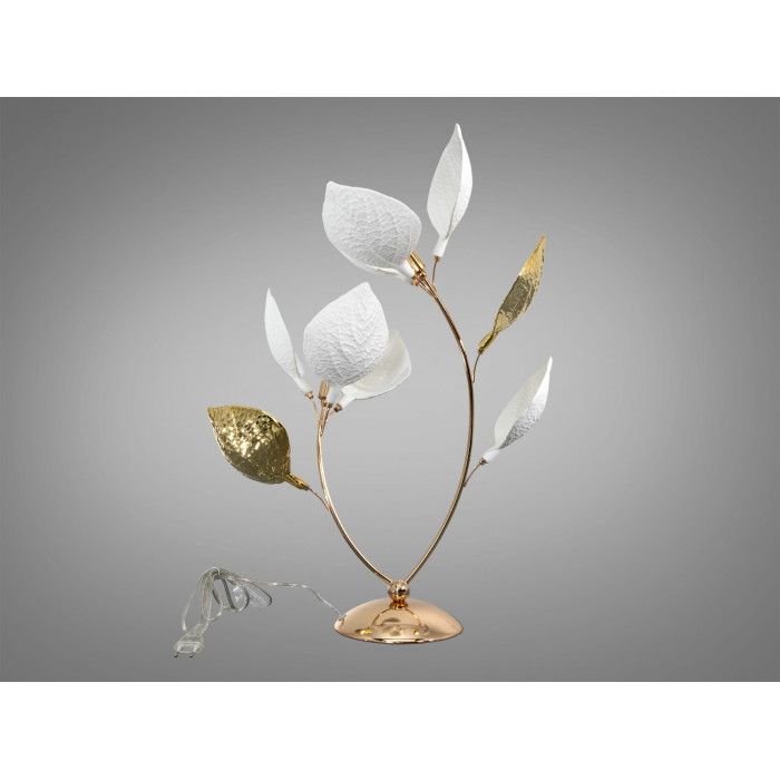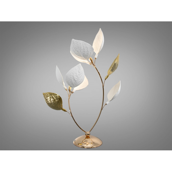 Настільна лампа зі світильниками E14 на 2 джерела світла від TM «Діаша» поєднує теплий відтінок золота та білі керамічні елементи, що нагадують листки або пелюстки. Модель створює м’яке направлене світло для робочих завдань і акцентної підсвітки, а також додає простору декоративний штрих без перевантаження інтер’єру.
