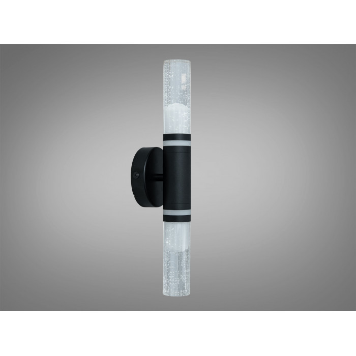 Основою є компактна кругла металева платформа з матовим чорним покриттям та вертикально закріплений циліндричний скляний плафон. Мікропухирці всередині скла створюють декоративний «бульбашковий» малюнок, що розсіює світло і пом’якшує блиск. Такий прийом допомагає отримати комфортний акцент без різких тіней, що доречно біля дзеркала або в проходах. Лаконічний силует легко поєднати з мінімалізмом, контемпорарі та сучасною класикою.