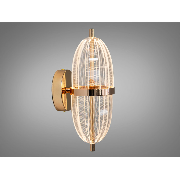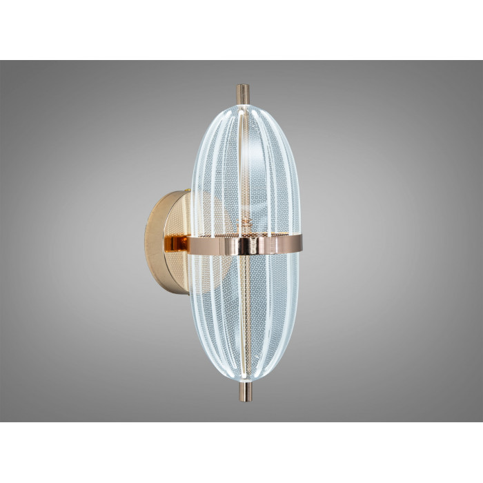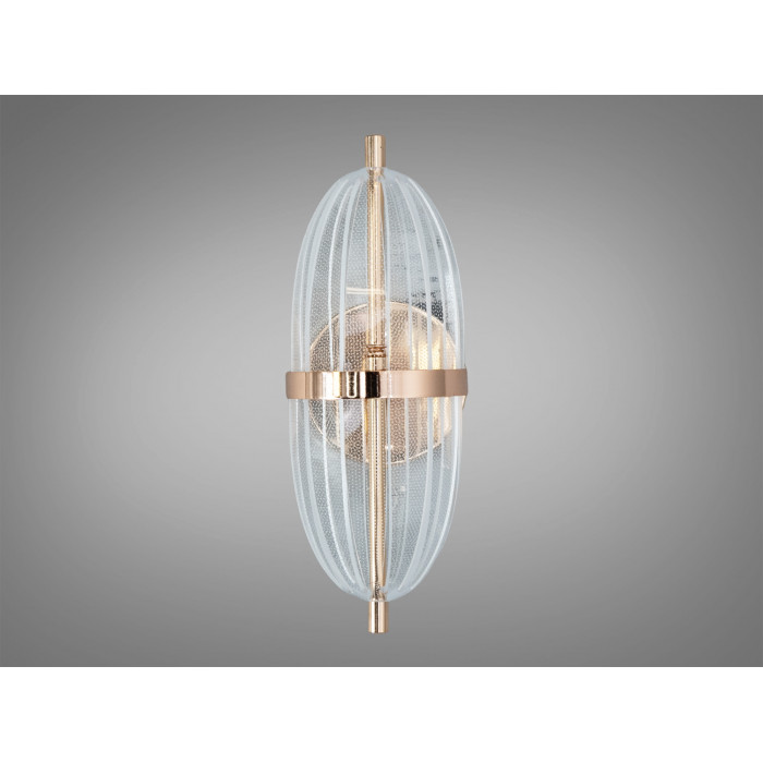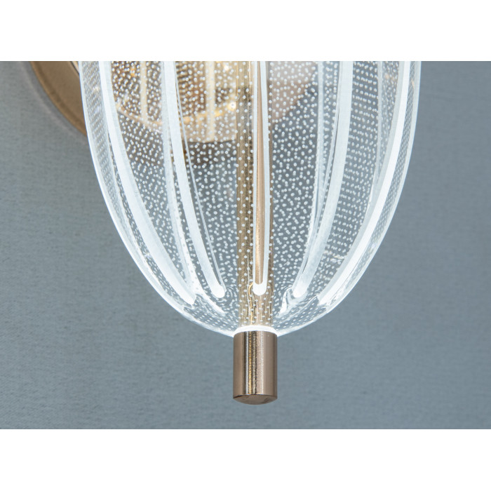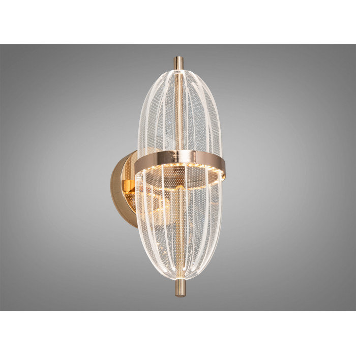 Матеріали та довговічність. Основу складає металевий каркас, що додає жорсткості та акуратного прилягання до стіни. Декоративний прозорий плафон полегшує конструкцію й спрямовує світловий потік, створюючи легкий візерунок відблисків. Золоте покриття підкреслює теплі нотки інтер’єру та поєднується з латунною або світлою фурнітурою.