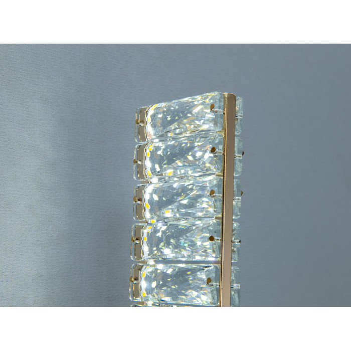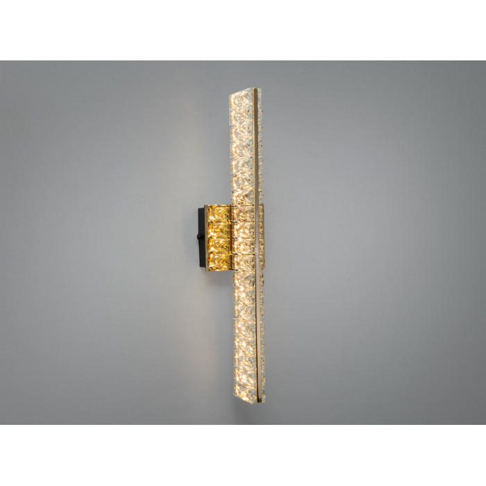 Настінне бра з кришталевими елементами у теплому золотому покритті створює м’яке відбиття світла та підкреслює фактуру стіни. Подовжена вертикальна форма та прозорі кришталеві деталі формують візуально рівномірний світловий потік без засліплення, що пасує до сучасних інтер’єрів, холів та коридорів. Потужність 15 Вт дає змогу отримати комфортне декоративне й функціональне підсвічування зон відпочинку, дзеркал або арт-об’єктів.