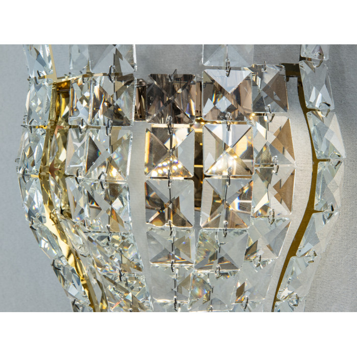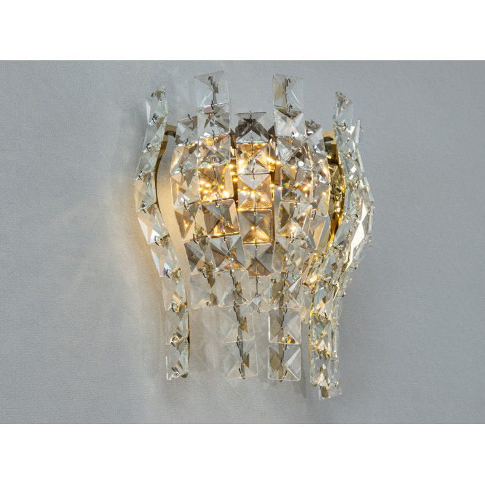 Основа з металу з золотою обробкою формує теплий відтінок світла й підкреслює блиск кришталевих елементів. Багатогранні вставки утворюють геометричний мозаїчний малюнок: при ввімкненні відблиски сяють на стіні та поверхнях поруч, додаючи простору глибини. Компактний формат бра дозволяє розміщувати його парами по обидва боки дзеркала, ліжка або картини. Завдяки кришталевим деталям світловий потік частково розсіюється, частково відбивається, що створює м’яке, але виразне підсвічування з декоративним ефектом.