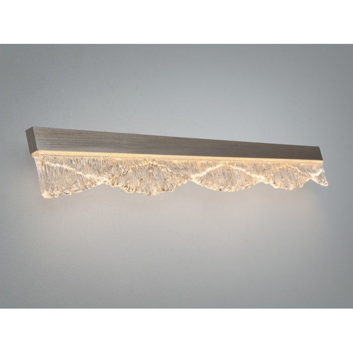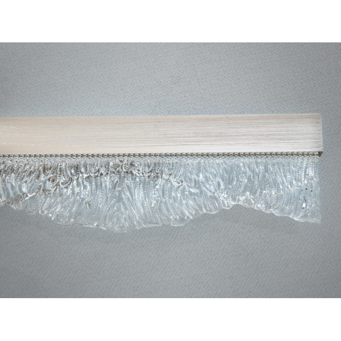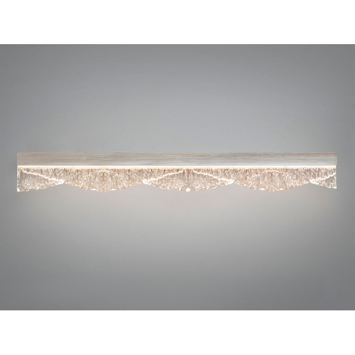 - Зовнішній вигляд: тонка настінна планка з акуратною основою у кольорі золота. Прозоре хвилясте (гофроване) скло створює м’яке розсіювання та візуально «пом’якшує» світловий потік без різких відблисків.